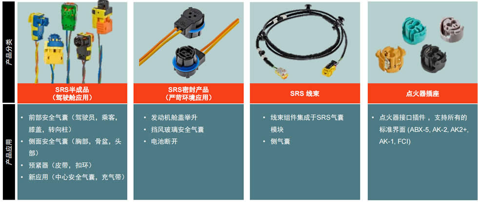 针对特殊应用场景打造专属解决方案,核心涵盖安全气囊线束及连接器、高速数据传输线束及连接器、车窗玻璃用连接器及线束等品类。其中安全气囊连接器(SRS产品)在安全约束系统连接领域处于世界领先水平,可适配前部、侧面、中心安全气囊及预紧器等全系列应用,包含驾驶舱用半成品与严苛环境用密封产品,是汽车被动安全系统的关键核心部件;车窗玻璃连接器提供预焊接端子、特殊线束总成及定制焊接系统,具备低接触电阻特性,适配电加热后窗、可加热雨刮器等场景,配备专业应用工程师提供全流程技术支持。