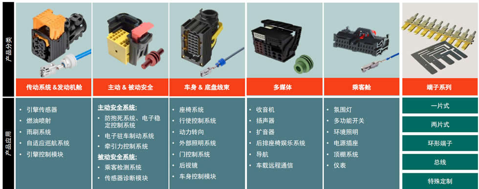 作为安波福最完善的产品线之一,低压连接器系统覆盖塑壳、端子、密封圈、设备端/板端连接器等全品类,可满足绝大多数汽车连接场景需求。其中端子系列包含一片式、两片式、环形端子及特殊定制款,采用厂内高速冲压制造,搭配自动化在线检测,确保产品一致性与可靠性;设备端/板端连接器涵盖机电一体化连接器、公端连接器等,端子数量可适配2至300+根需求,支持压配合装配技术,广泛应用于引擎控制模块、车身及安全系统、舒适娱乐系统、转向系统等核心部件,兼具定制开发能力与复杂嵌件注塑成型技术优势。